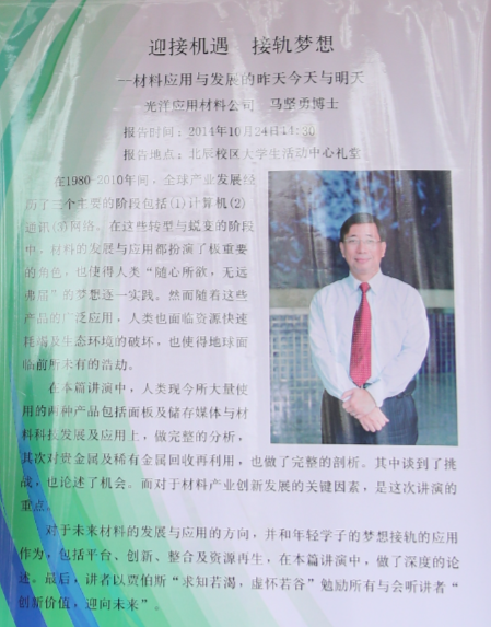 应yl23455永利集团邀请,台湾光洋集团执行董事马坚勇博士于2014年10月24日来我校访问并做学术报告,欢迎广大师生积极参加! 报告时间:10月24号,下午2:30-5:00 报告地点:北辰大学生活动中心礼堂 报告题目:迎接机遇接轨梦想——材料应用与发展的昨天今天与明天 内容简介:报告主要分析了面板及储存媒体与材料科技发展及应用的关系,对贵金属及稀有金属回收再利用进行了完整的剖析,重点讲述了材料产业创新发展的关键因素,以及未来材料的发展与应用方向。 马坚勇博士简介 马坚勇,德国斯图大学博士,台湾光洋应用材料科技股份有限公司执行董事。 马博士曾任台湾中山科学研究材料发展中心担任副工程师,于1997年获得台湾优秀青年工程师。2000年加入华新丽华公司,建立起台湾第一个微机电八吋制造厂和CMOS-MENS的技术平台,于2005年获台湾微机电产业贡献奖。2007年加入光洋应用材料公司,带领公司取得高密度硬盘用靶材国际市场占有率第一,公司获得2012及2013年台湾工业精锐奖及产业创新奖,并于2014年获得台湾年度材料杰出贡献奖。