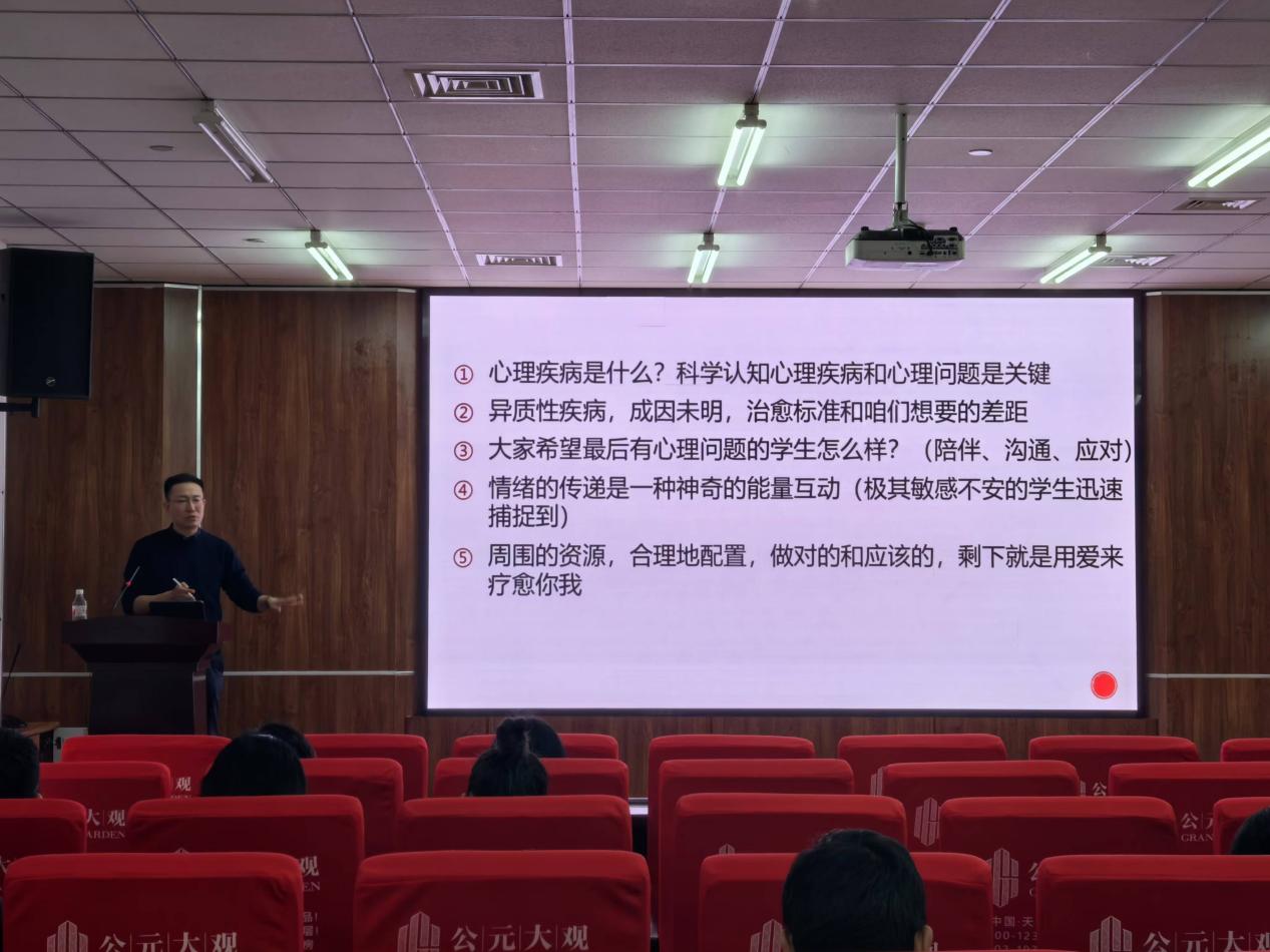 与此同时,吴主任结合近年来国内高校研究生危机事件和我校研究生心理健康状况测评结果,总结分析了我校学生群体心理问题的特点以及在学业、就业、人际、情感、家庭及精神方面的问题表现及成因。向与会老师介绍了研究生群体常见心理危机的类别及其在情绪、行为、身体、感知和精神状态等方面的表现,帮助大家明确相关问题的早期判断标准。