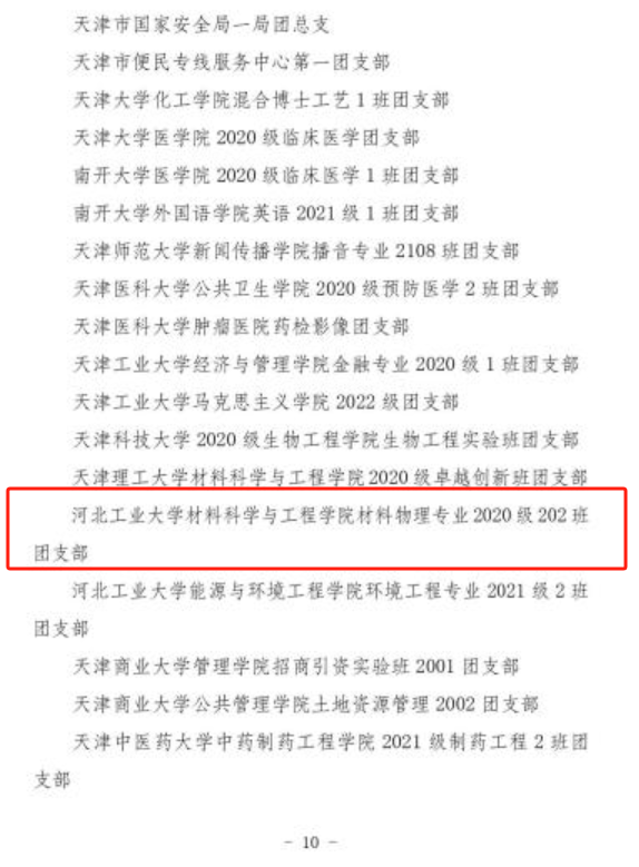 根据天津共青团发布的《关于表彰第23届天津青年五四奖章(集体)、2023 年天津市五四红旗团委(团支部)、天津市优秀共青团员、天津市优秀共青团干部的决定》,我院材物202团支部名列其中,获评2023年天津市五四红旗团支部荣誉称号!