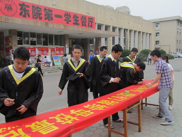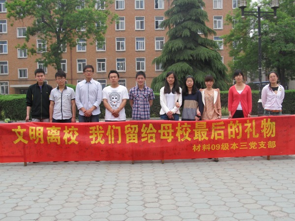 5 月13日中午我党支部在东院第一食堂门前组织以“文明离校 留给母校最后的礼物”为主题的签名活动。活动过程中我学院毕业生积极响应学院党组号召,纷纷前来签名留言,活动现场气氛热烈,达到了预期的目的。不少穿着学士服的毕业生走过宣传条幅前,都主动留下了自己的名字并对活动给与了高度的评价,纷纷表示文明离校,为母校留下最后的礼物。第二节课后,路过的大一、大二、大三学弟学妹们也签上了自己的姓名并留下了对母校及毕业生的祝福。随着时间的推移,我们的活动结束啦,最后我们签上自己的名字并合影留念。