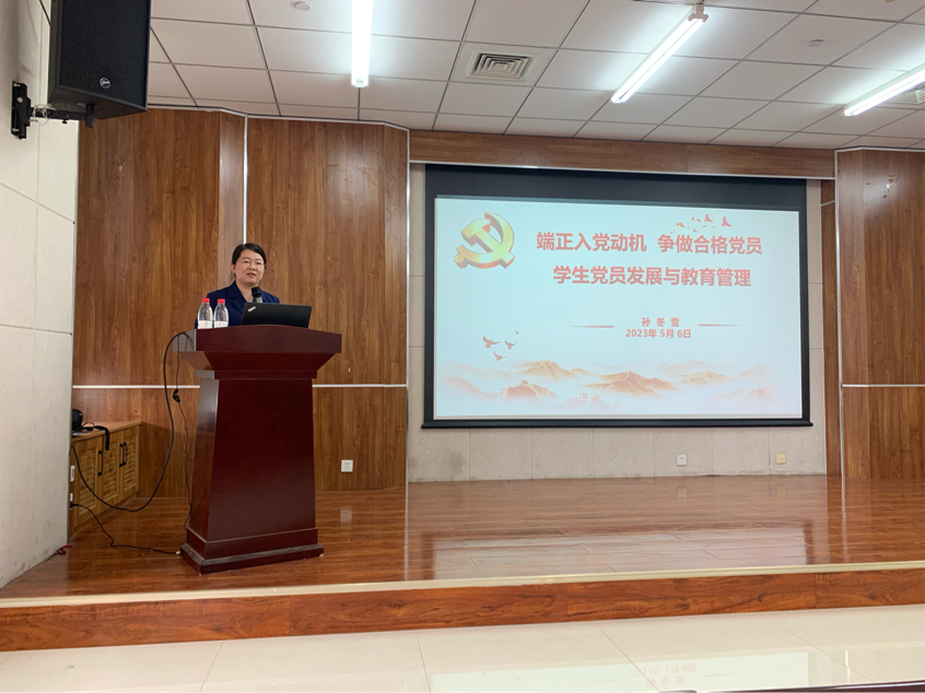 2023年5月6日下午2:00,校党委组织部正科级组织员孙冬雪以“端正入党动机,争做合格党员”—学生党员发展与教育管理为主题为我院学生支部书记及入党积极分子百余人讲授党课,以促进同学们端正入党动机,不忘初心、全心全意为人民服务。党课由学院组织员杨璐一主持。