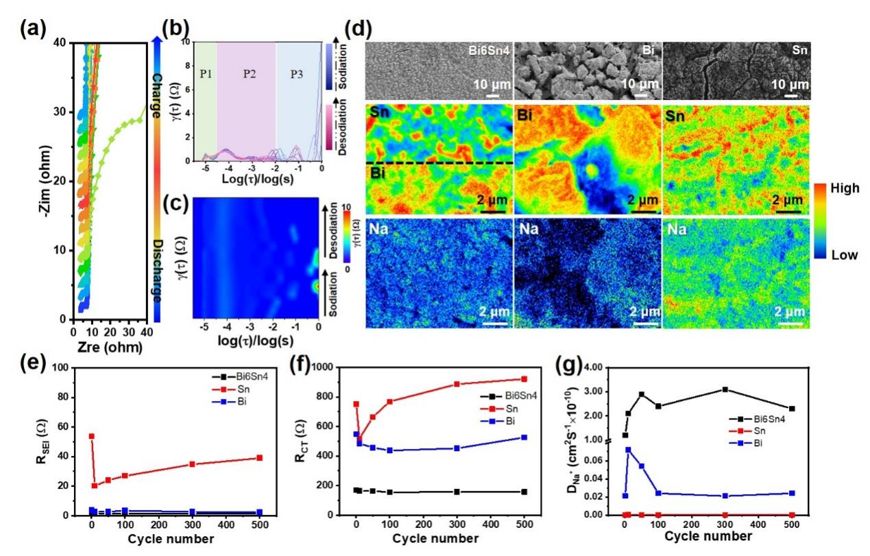 图5 储钠过程的Na+扩散行为和界面分析。a,Bi6Sn4负阳极在初始充放电过程中的原位GEIS图。b,相应的DRT曲线。c,转换后的DRT等高线图。d,首次循环后的Bi6Sn4、Bi和Sn的表面SEM图和EPMA元素分布图。e-g,Bi6Sn4、Bi和Sn负极在500次循环内的RSEI、RCT和DNa+分布。