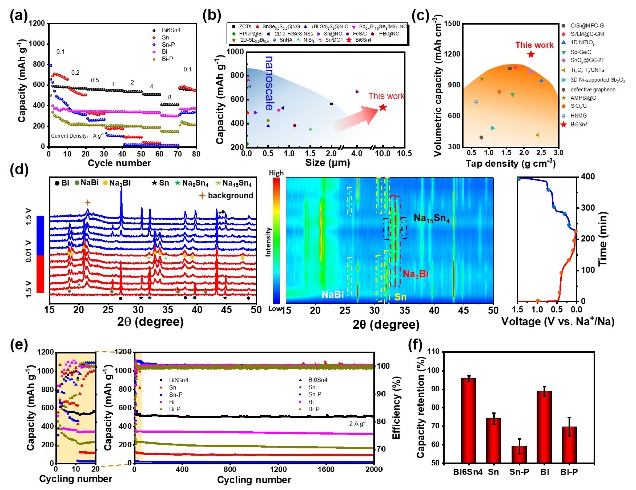 图4 Bi6Sn4负极的电化学性能。a,不同电流密度下的倍率性能(Bi-P和Sn-P分别代表由商用Bi粉末和商用Sn粉末制备的负极)。b,与之前报道的纳米尺度负极的倍率性能的对比。c,与之前报道的负极的体积比容量对比。d,Bi6Sn4负极在初始循环过程中的原位XRD。e,长期循环性能。f,相应负极的循环容量保持率对比。