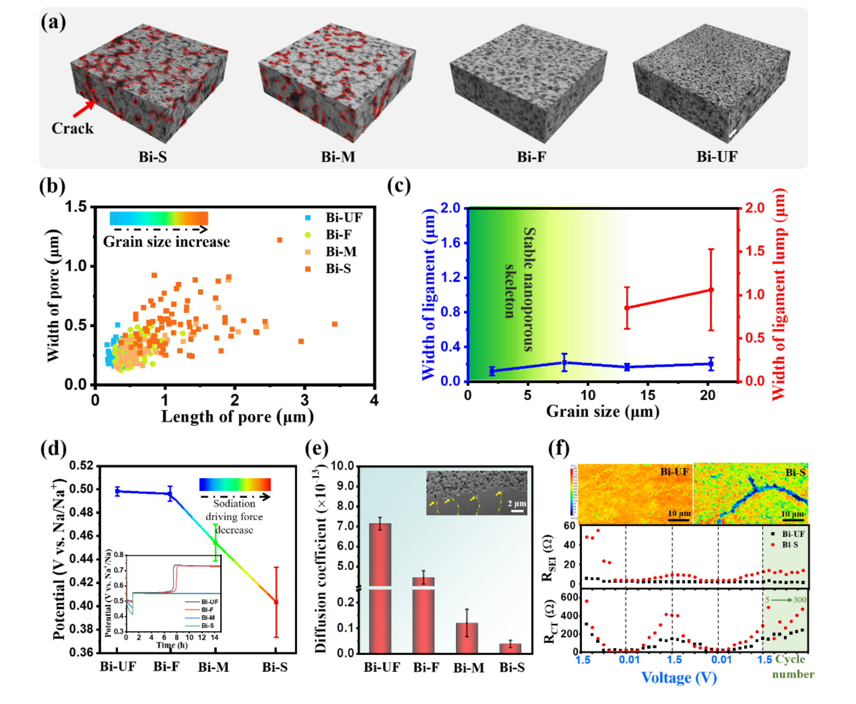 图4 GBs对钠化行为的影响。a,100次循环后Bi条带的三维重构SEM图(比例尺=1 μm)。b,相应的孔径分布与晶粒尺寸的关系。c,相应的韧带尺寸与晶粒尺寸关系。d,不同晶粒尺寸的铋条带的电压分布,电压是在钠化25%后搁置15小时后测量得到的。插图是相应电压曲线与时间的关系。e,不同晶粒尺寸的铋负极的钠离子扩散系数(DNa+)。f,10次循环后Bi-UF和Bi-S表面的电子探针(EPMA)元素分布图(上),Bi-UF和Bi-S在300次循环内的RSEI和RCT分布(下)。