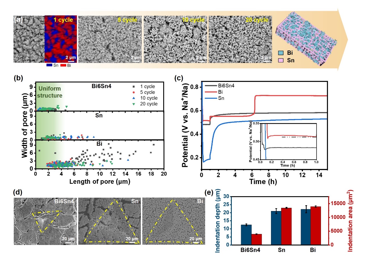 图6 电化学-机械性能耦合演变。a,Bi6Sn4在循环过程中的结构演变。b,Bi6Sn4、Bi和Sn负极在循环过程中形成的三维多孔骨架的孔径分布。c,Bi6Sn4、Bi和Sn负极在储钠100 mAh g-1后随后搁置14 h的电压曲线。d,Bi6Sn4、Bi和Sn条带在10次循环后的微压痕的表面SEM图。e,相应的压痕深度和面积分布。