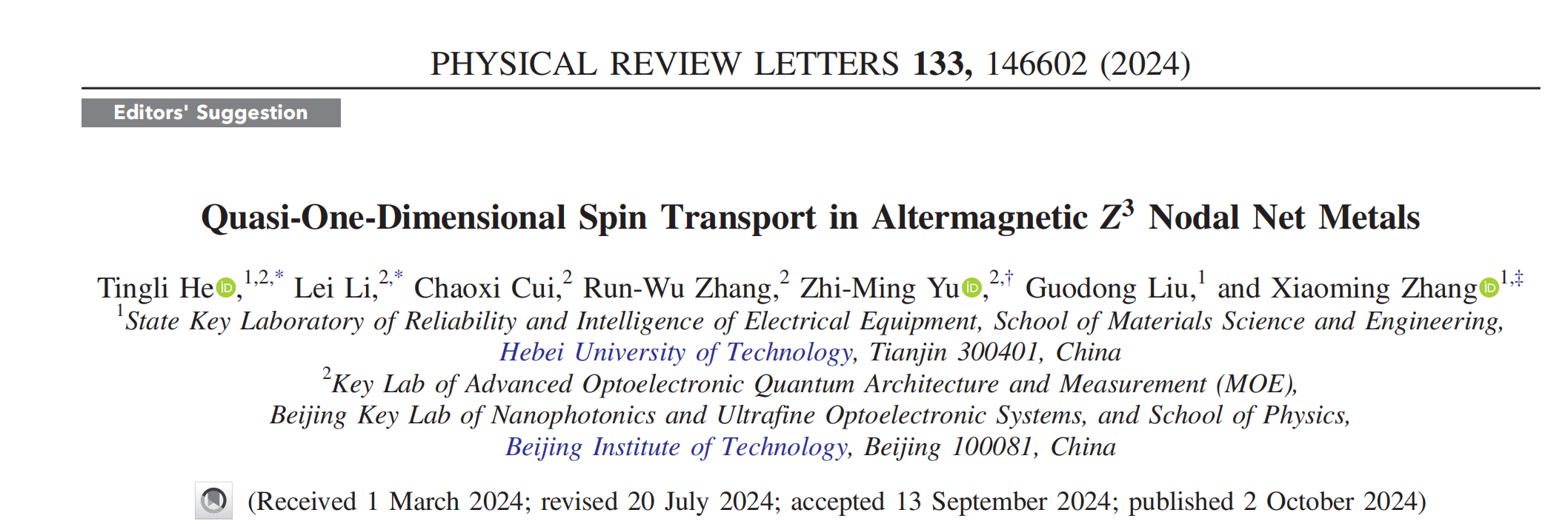 近日,材料科学与工程学院新型电子功能材料团队与北京理工大学合作在物理类顶刊《Physical Review Letters》上发表了题为“Quasi-One-Dimensional Spin Transport in Altermagnetic Z3 Nodal Net Metals”的研究型论文(入选Editors’ Suggestion)。yl23455永利集团为第一完成单位,材料科学与工程学院博士生何婷丽与北京理工大学李磊博士为论文共同第一作者,张小明教授与北京理工大学余智明教授为论文共同通讯作者。