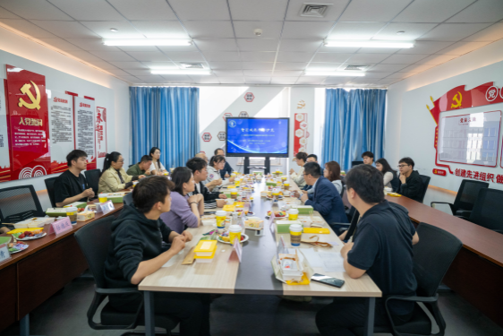 众人共同围坐在C535的长桌前,手执餐具,轻松惬意。活动伊始的自我介绍环节,成为了思想碰撞与情感交流的起点。从初入校园、怀揣梦想的大一新生,到即将离校、壮志满怀的大四学子,再到沉浸学术前沿的硕博研究生;从悉心指导学生的研究生导师,到服务师生的教务老师,不同年级、不同岗位的师生们依次发言,围坐畅谈,氛围欢快融洽。
