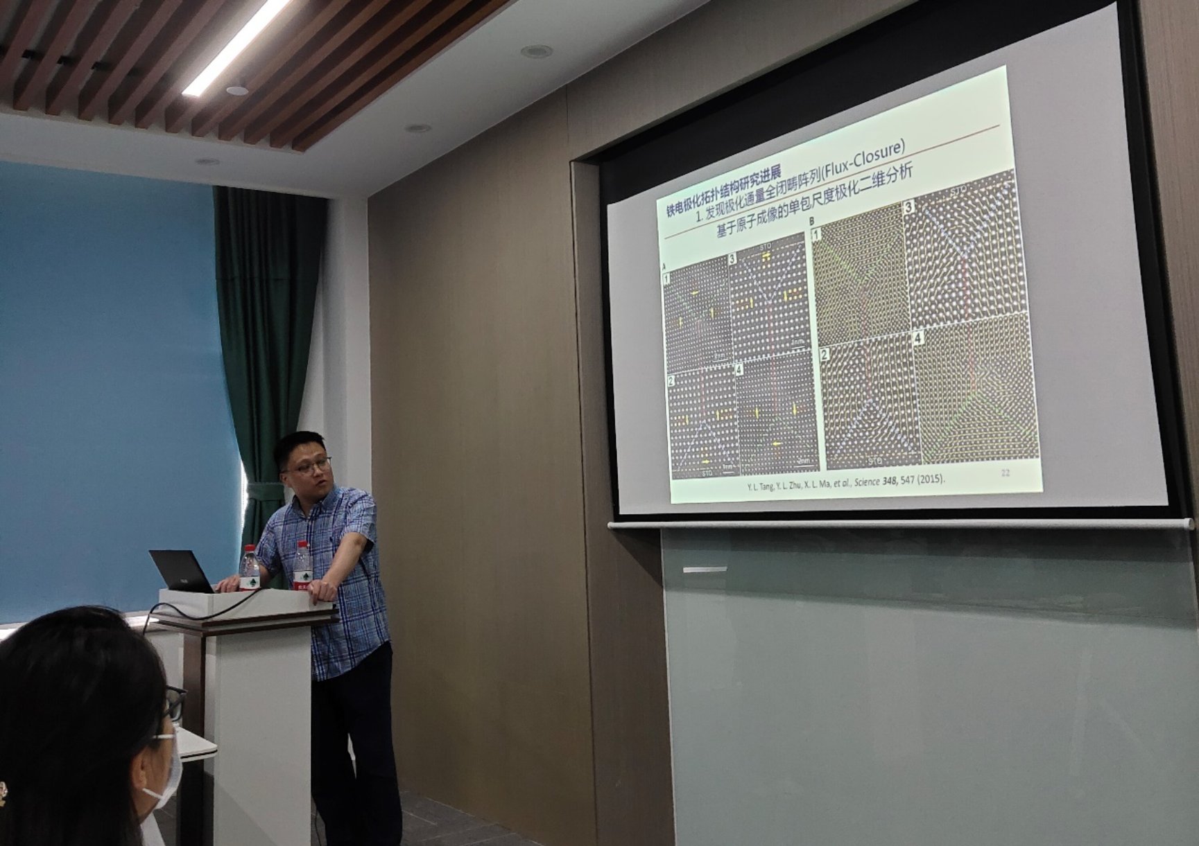 唐云龙首先介绍了其课题组的研究方向,接下来报告了近些年利用像差校正透射电镜在铁电极化领域所取得的突破性进展,主要包括极化通量全闭畴阵列、极化斯格明子晶格、极化波阵列的发现以及高指数取向膜中的特殊应变响应特征。最后唐云龙总结了原子尺度成像以及应变工程调控在极化拓扑结构调控研究中的重要作用。