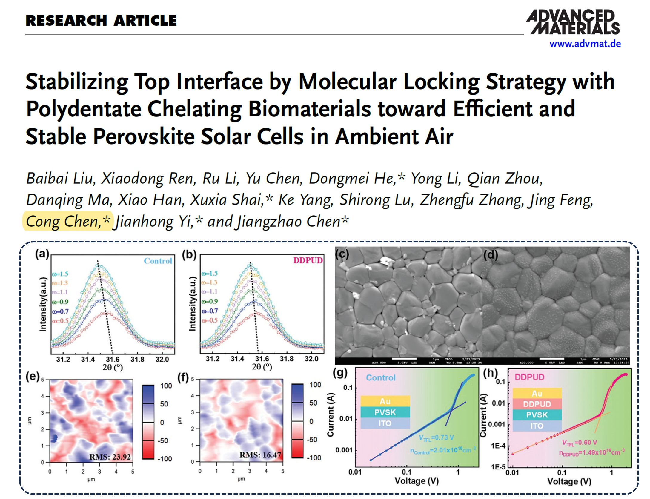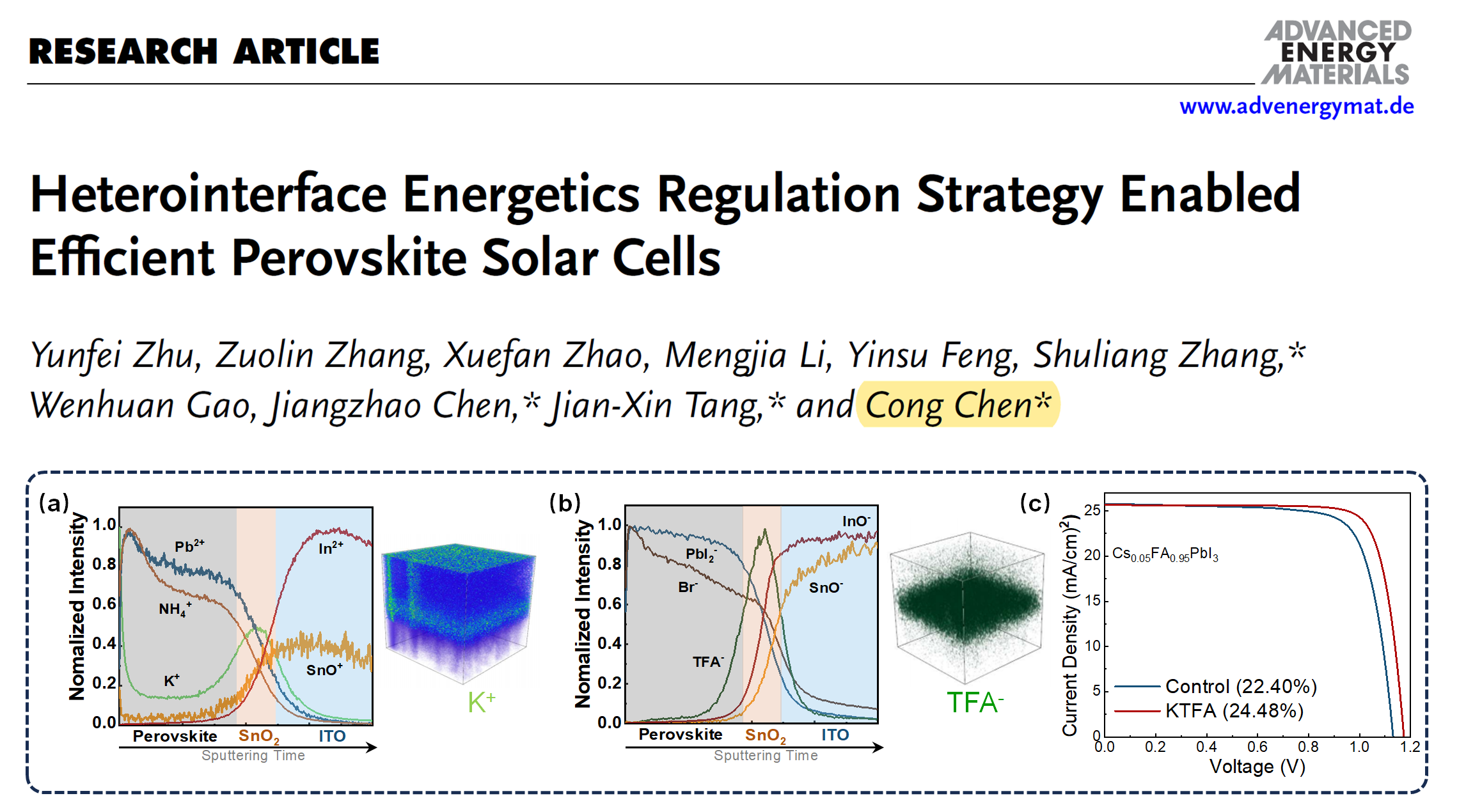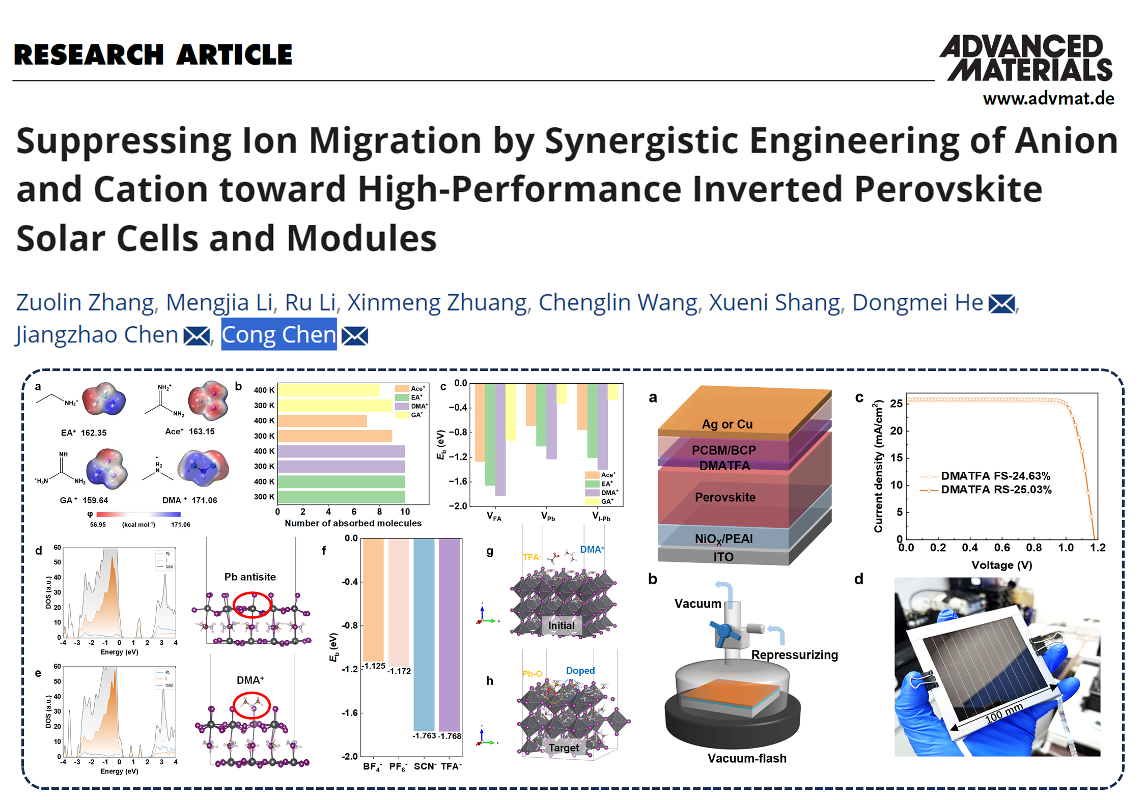2024年3月26日,国际高水平期刊《Advanced Materials》在线刊登了我院层状材料与器件团队陈聪教授及合作者在钙钛矿光伏电池方面取得的重要研究成果——阴/阳离子协同工程抑制离子迁移实现PCE>25%的钙钛矿光伏器件和PCE>20%的钙钛矿光伏模组。这是陈聪教授及合作者近一年内第三次在Advanced Materials刊发研究论文(Research article)。与此同时,相关针对钙钛矿光伏器件性能调控的研究工作也已经连续发表在Nano Letters、Angewandte Chemie、Advanced Energy Materials、Small等期刊,以上系列工作对深入理解和阐释基于晶体缺陷和界面能带调控实现高效钙钛矿光伏的前沿策略起到重要支撑作用。