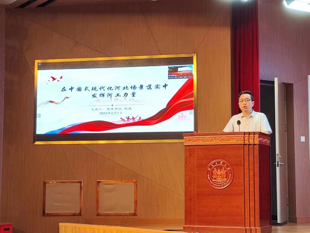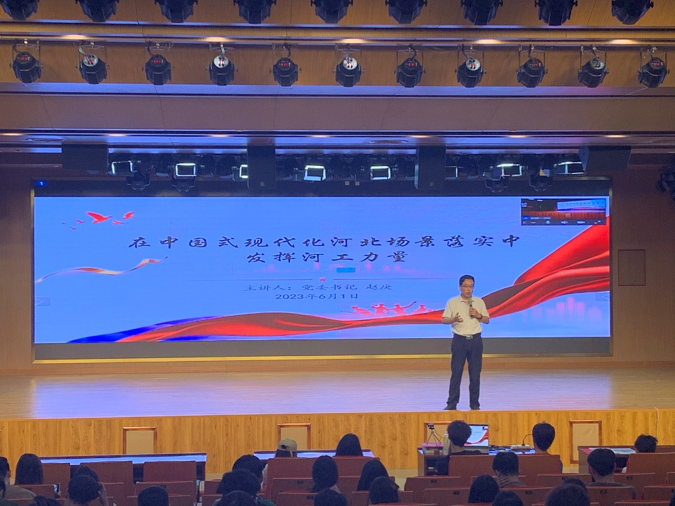 2023年6月1日晚18:30,学院党委书记赵庚以“在中国式现代化河北场景落实中发挥河工力量”为主题以线上线下相结合的形式为我院师生党员、发展对象、积极分子900余人讲授党课。党课由学院组织员杨璐一主持。