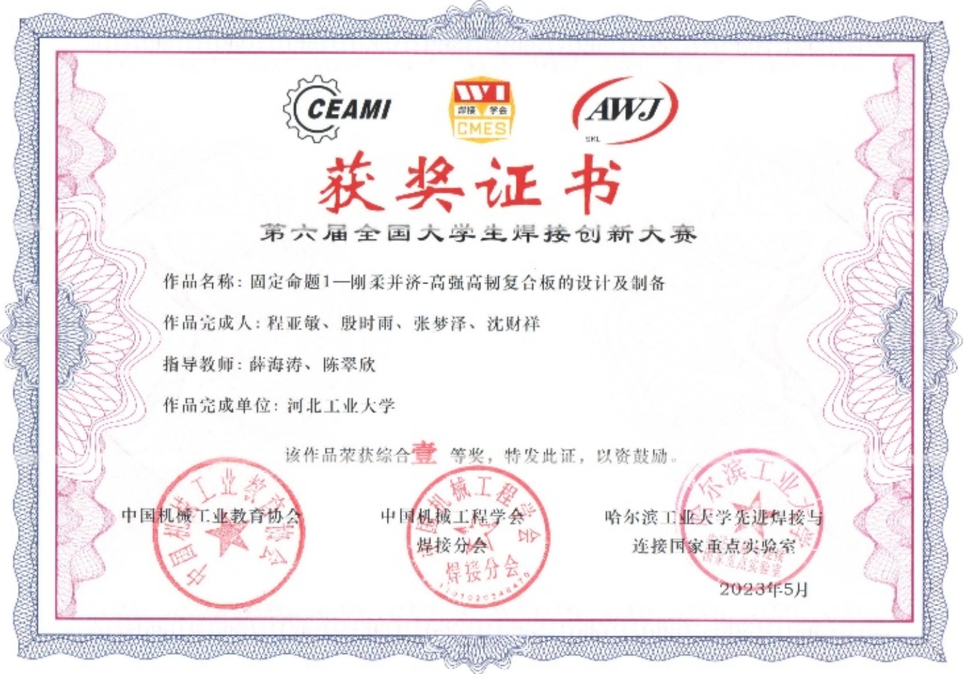 本届大赛是该项赛事创办以来参赛高校数量、参赛队伍数量、参赛师生数量最多的一届比赛,吸引了来自清华大学、哈尔滨工业大学、天津大学、西北工业大学、吉林大学、yl23455永利集团等62所国内高校的187项参赛作品,包含留学生在内的400余名师生参加比赛。本次大赛作品分固定命题和自选命题,通过作品测试和现场答辩环节综合确定比赛成绩,最终评选出32项一等奖、47项二等奖。其中由我院薛海涛、陈翠欣老师指导的成型202班程亚敏、殷时雨、张梦泽、沈财祥等同学的《刚柔并济--高强高韧复合板的设计及制备》作品获一等奖;由郭卫兵、薛海涛老师指导的202班刘子雨、石硕、张佳威、袁浩铭等同学的《Si/Cu异种材料连接机理及工艺优化》作品获二等奖。