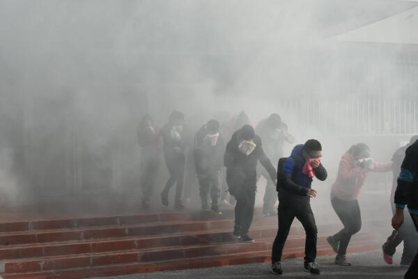 演习首先进行逃生能力演练。为了能使消防演习更加真实和贴近实际,让同学在演习中学到更多做的更好,此次特增加了无害烟罐设备的使用。在烟雾中同学们用毛巾捂着口鼻,沿着楼道的安全逃生标志牌指引,快速有序的撤离预定危险点。在逃生演习中,同学们沉着冷静,按照培训要求行动,避免出现踩踏事故。