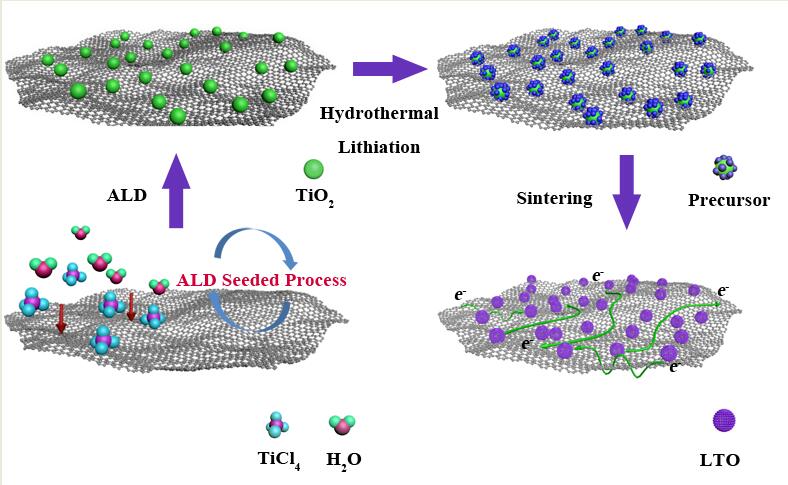 然而,从这种复合工作原理来看,负极的法拉第电化学反应和正极的双电层物理吸附机制存在着极大的动力学不匹配性,影响混合电容器的性能。钛酸锂是一种锂离子扩散机制控制的插层型负极,其独特的“零应变”结构赋予了钛酸锂极高的循环稳定性和安全性。然而钛酸锂较低的电子电导率和锂离子扩散系数严重影响了其倍率性能。近日,我院王恭凯老师以第一作者和通讯作者的身份,首次报道了利用原子层沉积育种技术制备钛酸锂/石墨烯复合电极材料,其独特的微观结构使得该材料充电25秒可实现70%的理论容量(即100 C电流密度时的放电容量高达120.8 mAh/g),并利用第一性原理从理论上进行了计算分析,该技术为制备新型石墨烯复合电极材料开辟了新思路。以该复合材料为负极的锂离子混合电容器的功率密度甚至超越了双电层型超级电容器,具有重要的研究意义和实际应用价值。该研究成果以题为“Toward ultrafast Lithium ion Capacitors: A novel atomic layer deposition seeded preparation of Li4Ti5O12/graphene anode”发表在纳米能源领域著名期刊《Nano Energy》(http://doi.org/10.1016/j.nanoen.2017.04.020, 2017年IF=12.343)上。