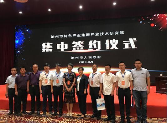 2019年8月9日上午,在沧州市金狮国际酒店,沧州市特色产业集群产业技术研究院集中签约仪式隆重举行。国家技术创新方法与实施工具工程技术研究中心主任檀润华、校工业技术研究院副院长丛继坤、材料学院党委书记尹宗毅、副院长郑士建、材料成型系主任李国禄、成型系教授刘金海、付彬国博士等一行出席了签约仪式。在河北省科技厅党组书记、厅长马宇骏、沧州市委书记杨慧、市长梅世彤、yl23455永利集团原副校长檀润华等领导的见证下,郑士建教授代表材料学院与泊头市人民政府市长张荣霞签定共建协议。