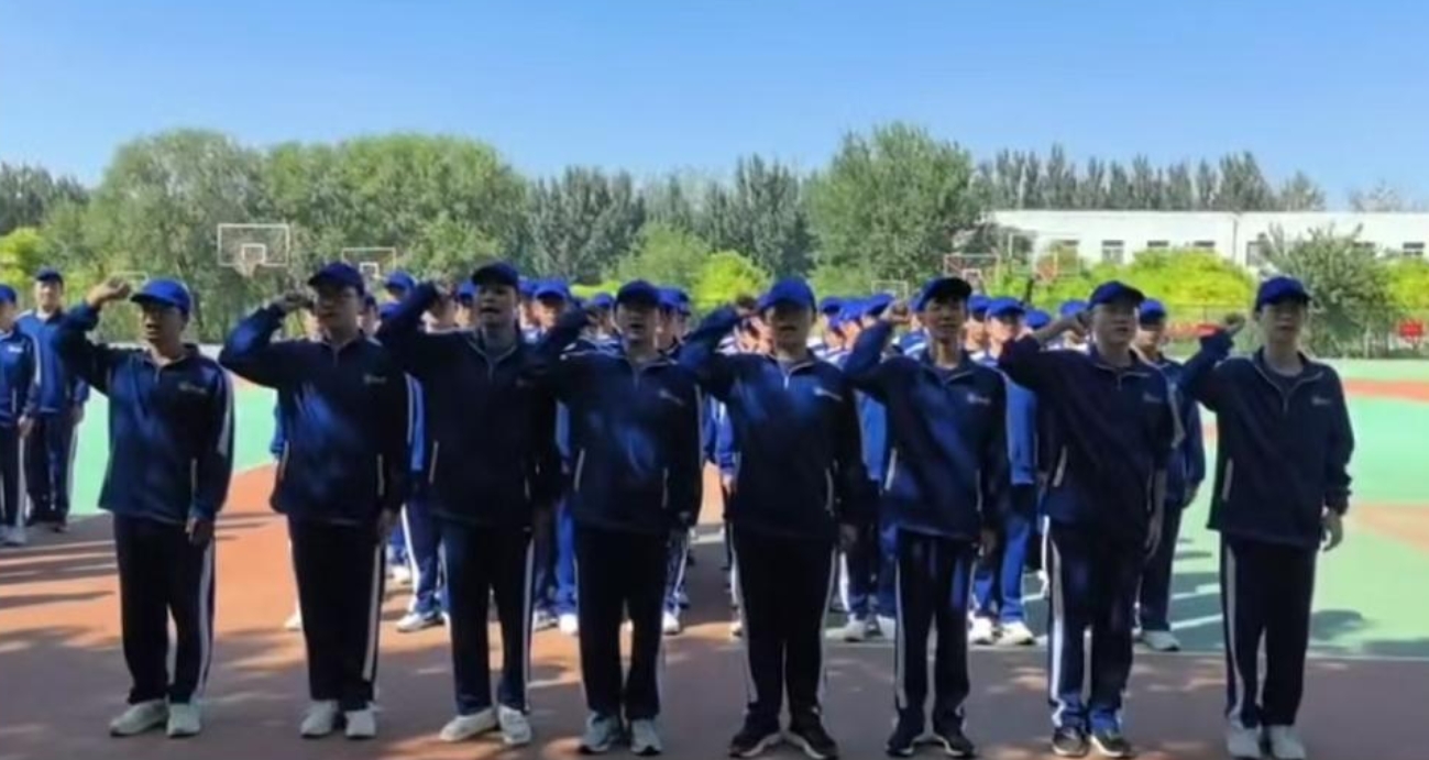 大会进行第三项,全体参训学生高举右拳,激情宣誓,全力军训,力争上游!