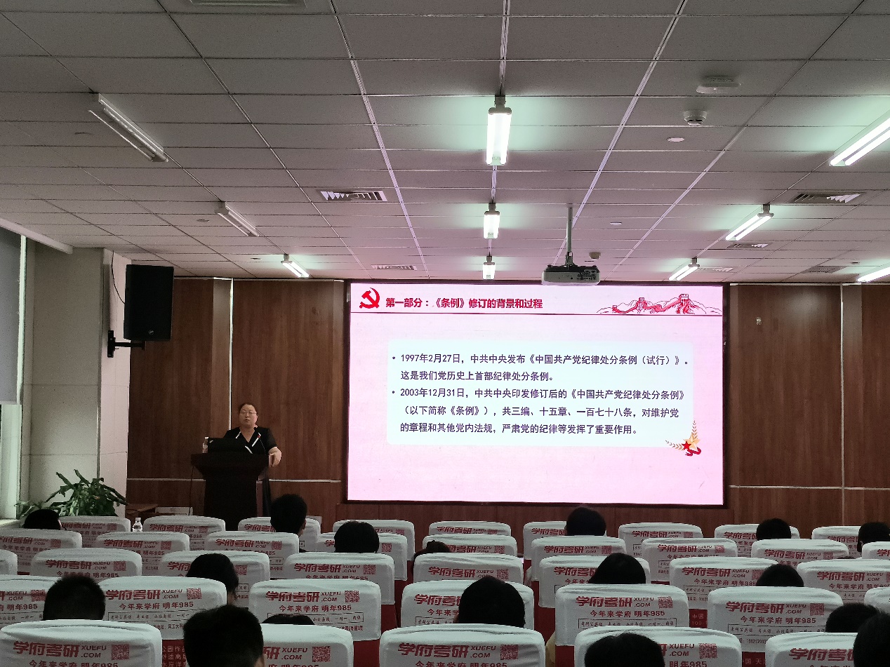2024年6月21日下午14:00,yl23455永利集团2023-2024年春季学期党课培训第九讲在机材楼514开展。本次党课以“全面加强党的纪律建设——《学习解读中国共产党纪律处分条例》”为主题,由学院正处级辅导员张雪莹担任主讲人,学院积极分子百余人参会。