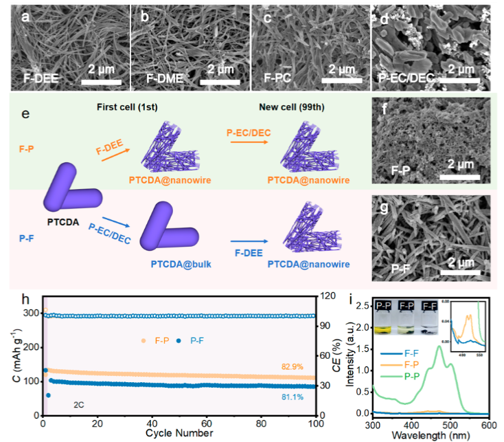 针对有机分子与有机溶剂间强相互作用致使其溶解的问题,选择了一种具有较低介电常数的溶剂乙二醇二乙醚(DEE)来开发具有弱溶剂化能力的F-DEE电解液。F-DEE电解液与3,4,9,10-苝四甲酸二酐(PTCDA)之间的弱相互作用,有效抑制了后者的溶解。同时,发现在该电解液中,砜基官能团能够诱导体相PTCDA演变成三维线性网络结构。该结构不仅有利于K+的快速扩散,还能够进一步抑制PTCDA的溶解。基于上述特性,PTCDA在F-DEE电解液中表现出优异的电化学性能。电化学测试表明,PTCDA电极在DEE基电解液中10C(1C = 100 mA g-1)电流密度下,可提供最大放电比容量为110.1 mA h g-1,循环2000周后容量保持率为89.1%。PTCDA||石墨全电池在1C电流密度下,经过300次循环后容量保持率为70.4%,具有125.0 W h kg-1的高能量密度和198.4 W kg-1的高功率密度。这项工作提出了一种抑制有机物溶解的新思路,并为深入研究电极材料的形貌演变提供了理论依据。(Nano Letters, 2024, 24, 4546-4553)。