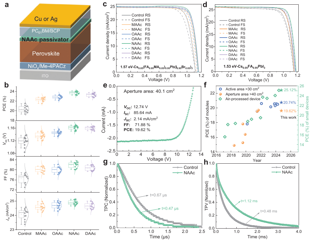 针对表面缺陷和非辐射复合限制性能和稳定性的问题,提出了一种创新的界面工程方法。利用不同烷基链长度的有机铵盐,研究了其对分子取向和空间位阻的协同调控作用,从而实现对钙钛矿薄膜表面缺陷的优化钝化。研究表明,最佳烷基链长度的非氟化铵盐不仅增强了与表面缺陷的化学相互作用,同时避免了过长链引起的空间位阻问题,从而实现了更高效的缺陷钝化和带隙对齐。通过这种方法,开发出效率高达25.79%(第三方机构认证效率25.12%)的反式PSC及组件,并具备优异的运行稳定性。