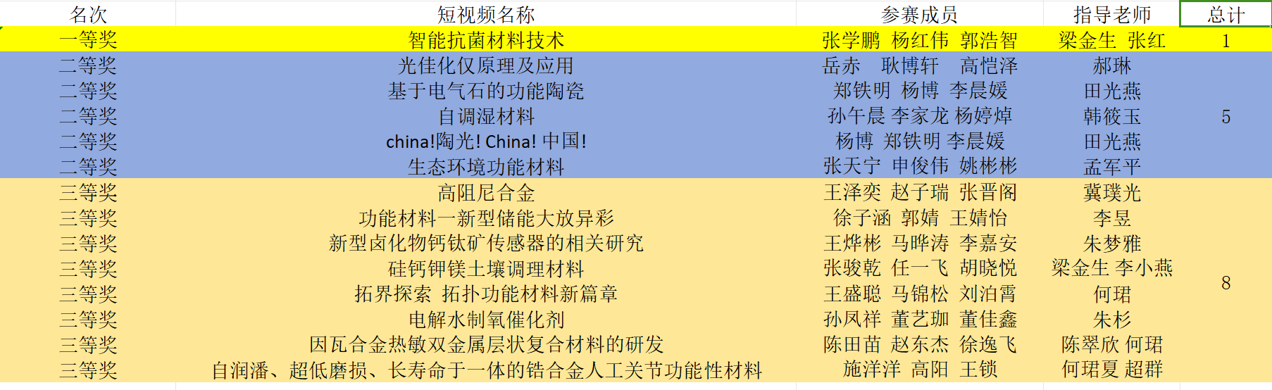 《第一届全国大学生功能材料短视频大赛》于 2024年举办,《第一届全国大学生功能材料短视频大赛》组委会共收到来自国内46所高校的324份作品,yl23455永利集团在大赛中表现突出,1人获得一等奖,5人获得二等奖,8人获得三等奖!总体获奖情况在参赛高校中名列前茅。