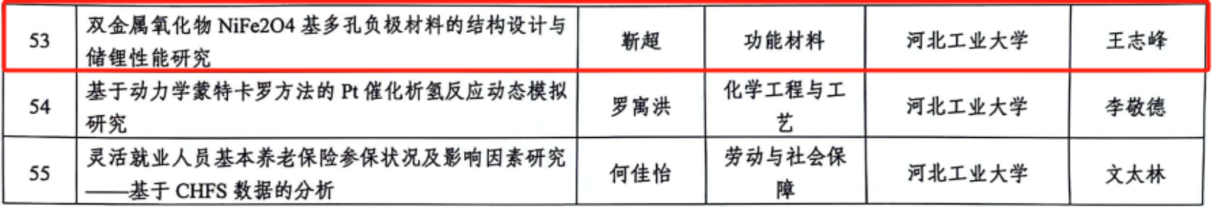 市教委聘请各有关学科领域专家组成评审委员会,对各学校的申报材料进行了认真评议,共有55份毕业设计(论文)通过评审。其中yl23455永利集团功能材料192班靳超撰写的《双金属氧化物NiFe2O4基多孔负极材料的结构设计与储锂性能研究》通过评审,指导教师为王志峰教授。