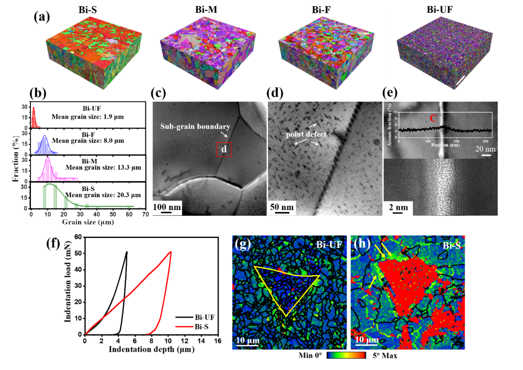 图2 微尺寸Bi负极的GBs特性。a,三维重构EBSD反极图(IPF)图(标尺=35 μm)。b,相应的晶粒尺寸分布图。c、d,Bi-UF的TEM图。e,EDS分析,表明石墨烯的存在。f,微米压痕载荷-位移曲线。g、h,相应的EBSD KAM图。