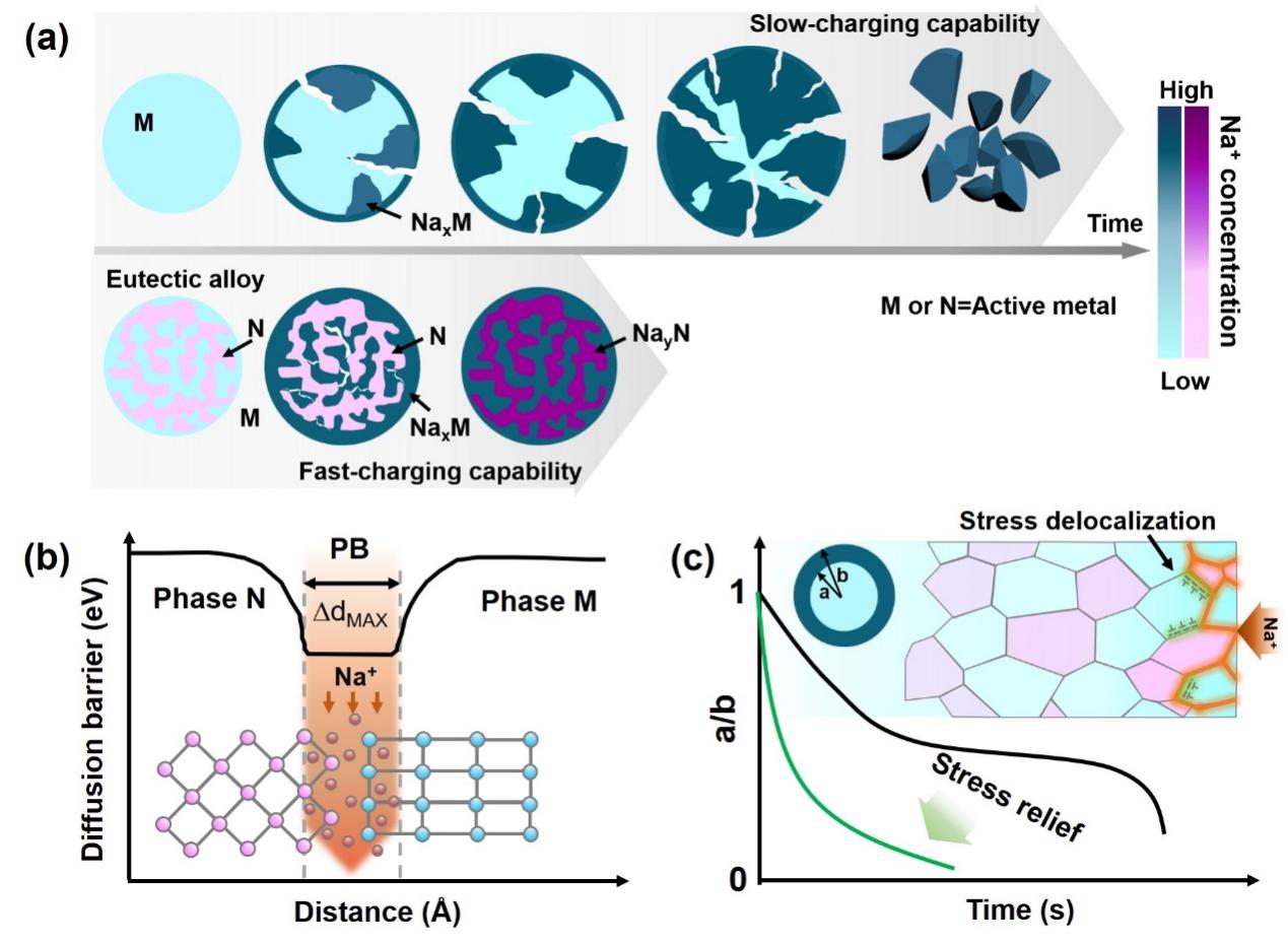 图1 用于SIB的微尺寸合金负极的GBs工程示意图。a,纳米和微米级负极材料的指标比较(ICE表示初始库仑效率,Ev表示体积比能量密度)。b,传统微尺寸合金负极在储钠过程中的问题和失效机制。c,从动力学、热力学和力学方面分析了GBs在电化学应力分散过程中对储钠性能的影响。