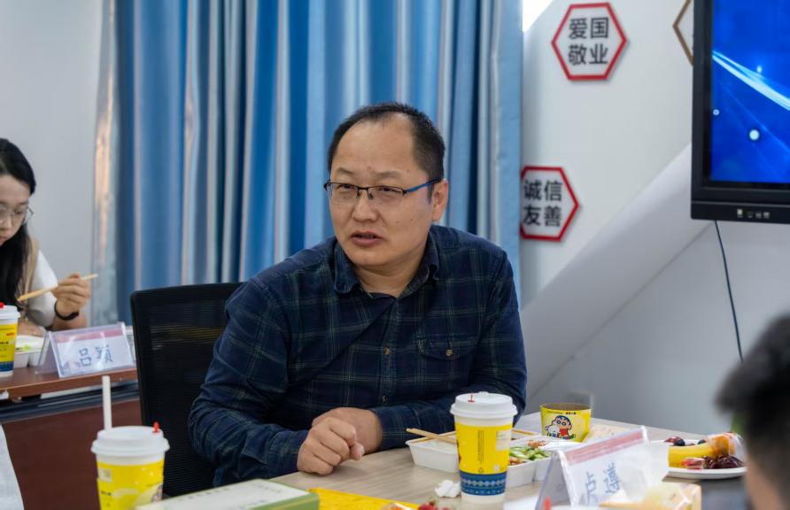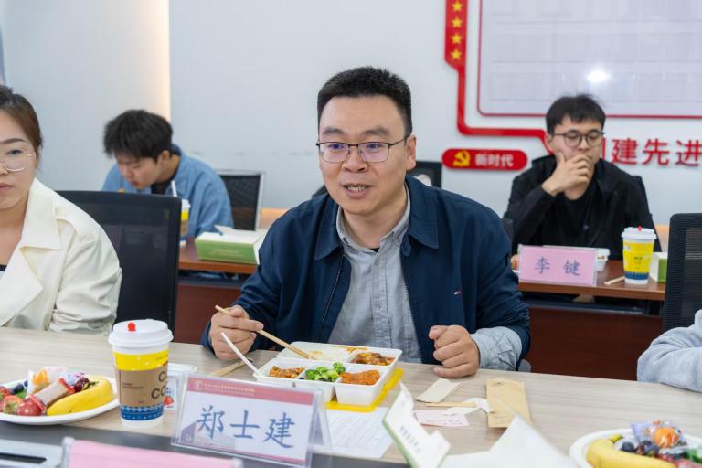 众人共同围坐在C535的长桌前,手执餐具,轻松惬意。活动伊始的自我介绍环节,成为了思想碰撞与情感交流的起点。从初入校园、怀揣梦想的大一新生,到即将离校、壮志满怀的大四学子,再到沉浸学术前沿的硕博研究生;从悉心指导学生的研究生导师,到服务师生的教务老师,不同年级、不同岗位的师生们依次发言,围坐畅谈,氛围欢快融洽。