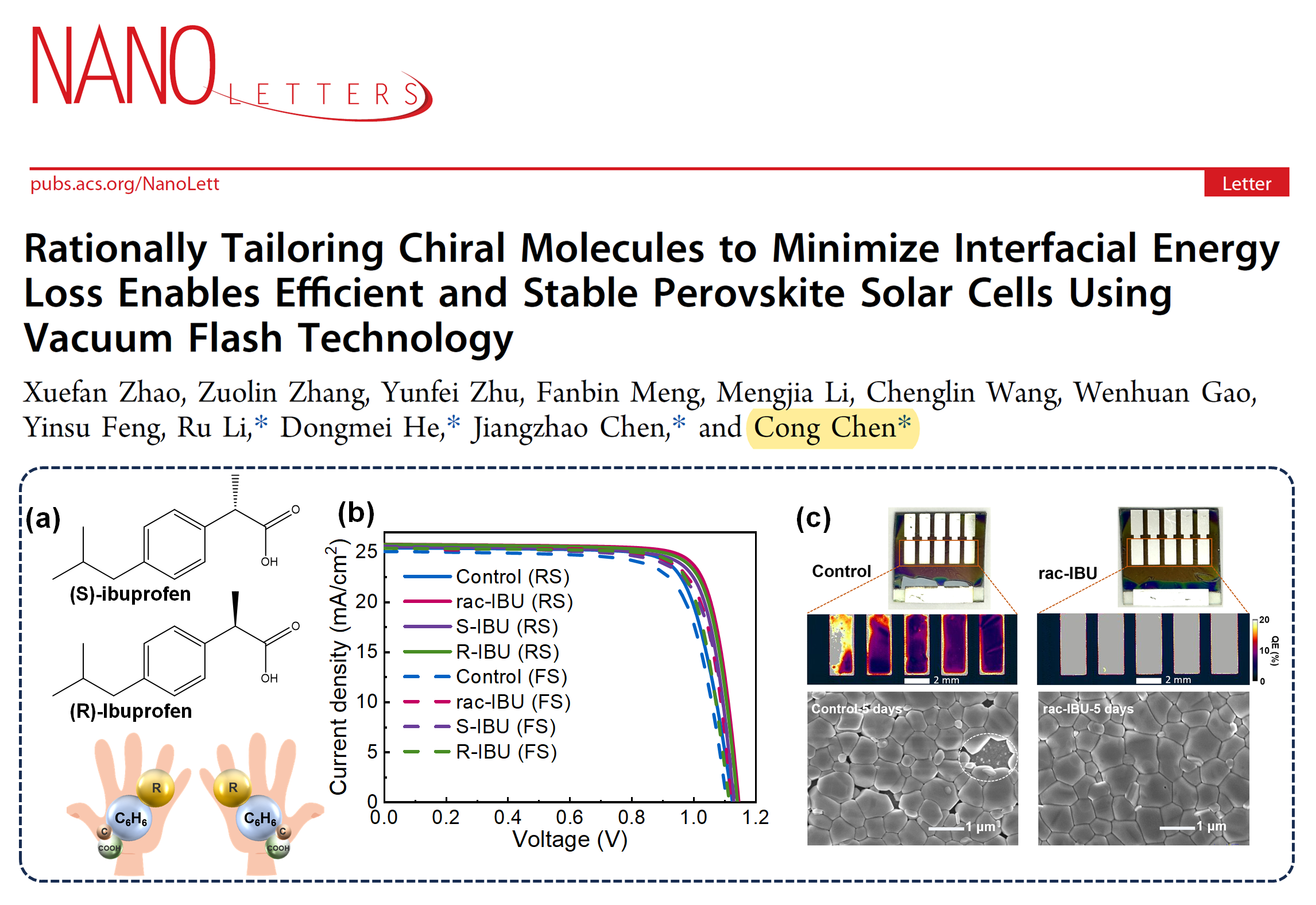 针对电池器件内部界面能带失配等问题,团队成员进一步提出了一种通过手性分子工程策略来抑制钙钛矿太阳能电池内部界面能量损失的方法。通过使用S-布洛芬(S-IBU)、R-布洛芬(R-IBU)和外消旋布洛芬(rac-IBU)三种具有羧酸官能团的配体分子对钙钛矿进行后处理,实现对器件内部界面缺陷以及界面能带对齐的调控。研究显示,rac-IBU分子在所有手性分子中具有最强的锚定能力(XPS、FTIR等表征发现具有最高的结合能),最终产生最佳的缺陷钝化效果。这种方法利用了手性分子独特的空间构象,有效地降低了界面缺陷和界面能量障碍,使基于真空闪蒸技术的器件实现超过24%的最大效率。此外,rac-IBU调控的电池器件在连续最大功率点跟踪1040小时后能够保持其初始性能的90%。这项研究的创新性在于手性分子工程及其高效与高稳定钙钛矿光伏器件的应用研究,它为通过控制分子的空间构象来抑制界面非辐射复合损失,降低Voc损失提供了一条可行的路径。论文的第一作者为我院2021级硕士研究生赵雪帆。(Nano Lett., 2023, 23, 11184.)