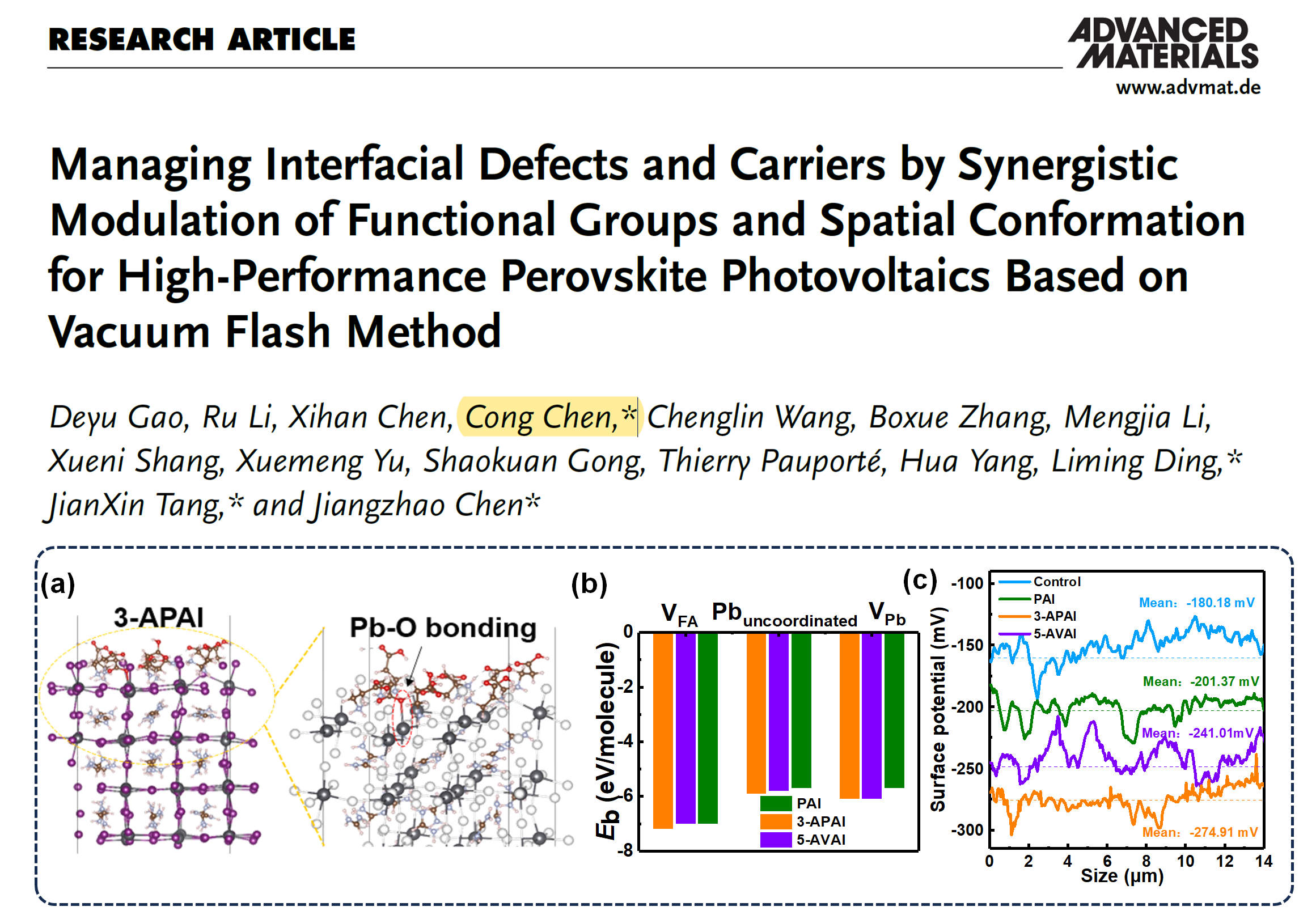 2024年3月26日,国际高水平期刊《Advanced Materials》在线刊登了我院层状材料与器件团队陈聪教授及合作者在钙钛矿光伏电池方面取得的重要研究成果——阴/阳离子协同工程抑制离子迁移实现PCE>25%的钙钛矿光伏器件和PCE>20%的钙钛矿光伏模组。这是陈聪教授及合作者近一年内第三次在Advanced Materials刊发研究论文(Research article)。与此同时,相关针对钙钛矿光伏器件性能调控的研究工作也已经连续发表在Nano Letters、Angewandte Chemie、Advanced Energy Materials、Small等期刊,以上系列工作对深入理解和阐释基于晶体缺陷和界面能带调控实现高效钙钛矿光伏的前沿策略起到重要支撑作用。