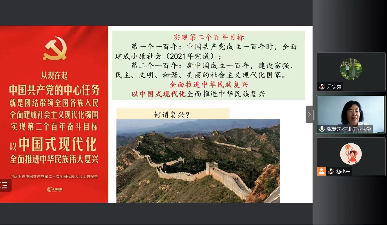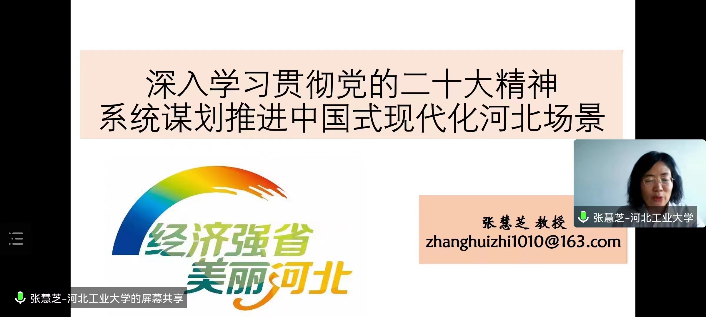 为深入学习宣传贯彻党的二十大精神,推动党的二十大精神深入人心、落地生根,2022年12月8日下午,材料学院党委邀请马克思主义学院副院长张慧芝教授为我院师生带来题为“深入学习贯彻党的二十大精神 系统谋划推进中国式现代化河北场景”宣讲报告,受疫情影响,宣讲采用线上形式进行,宣讲会议由学院党委书记尹宗毅同志主持,学院师生350人参会。