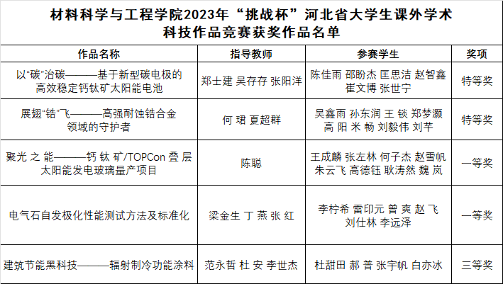 根据冀团联字〔2023〕10号文件《关于2023年“挑战杯”河北省大学生课外学术科技作品竞赛结果的通报》,我院“以‘碳’治碳——基于新型碳电极的高效稳定钙钛矿太阳能电池“等5项作品获奖。获奖情况如下: