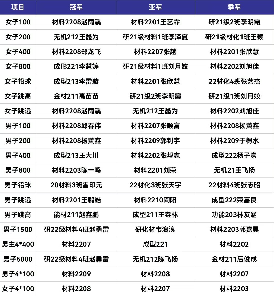 经过一天的比拼,本届运动会圆满落幕。以下为各项目前三名,让我们祝贺他们!