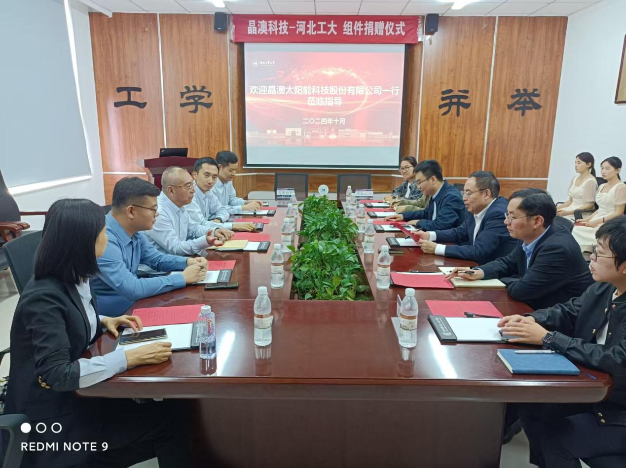 随后,双方就共建研发实验室事宜进行了深入讨论。孙广彬和欧阳子对双方已有的合作基础、实验条件、师资力量及研究方向表示肯定,并希望在此基础上进一步推进深入合作。他们提议建立中试线,鼓励科研成果的转化,并加强人才培养。马国伟副校长对此表示高度赞同,并详细介绍了学校的科研情况,强调学校将稳步夯实科研基础,强化成果转化落地。郑士建院长建议晶澳科技在天津设立研发中心,充分借力学校的区位优势和科研资源,以便于双方实现更紧密的合作,从而更好地服务光伏产业发展。