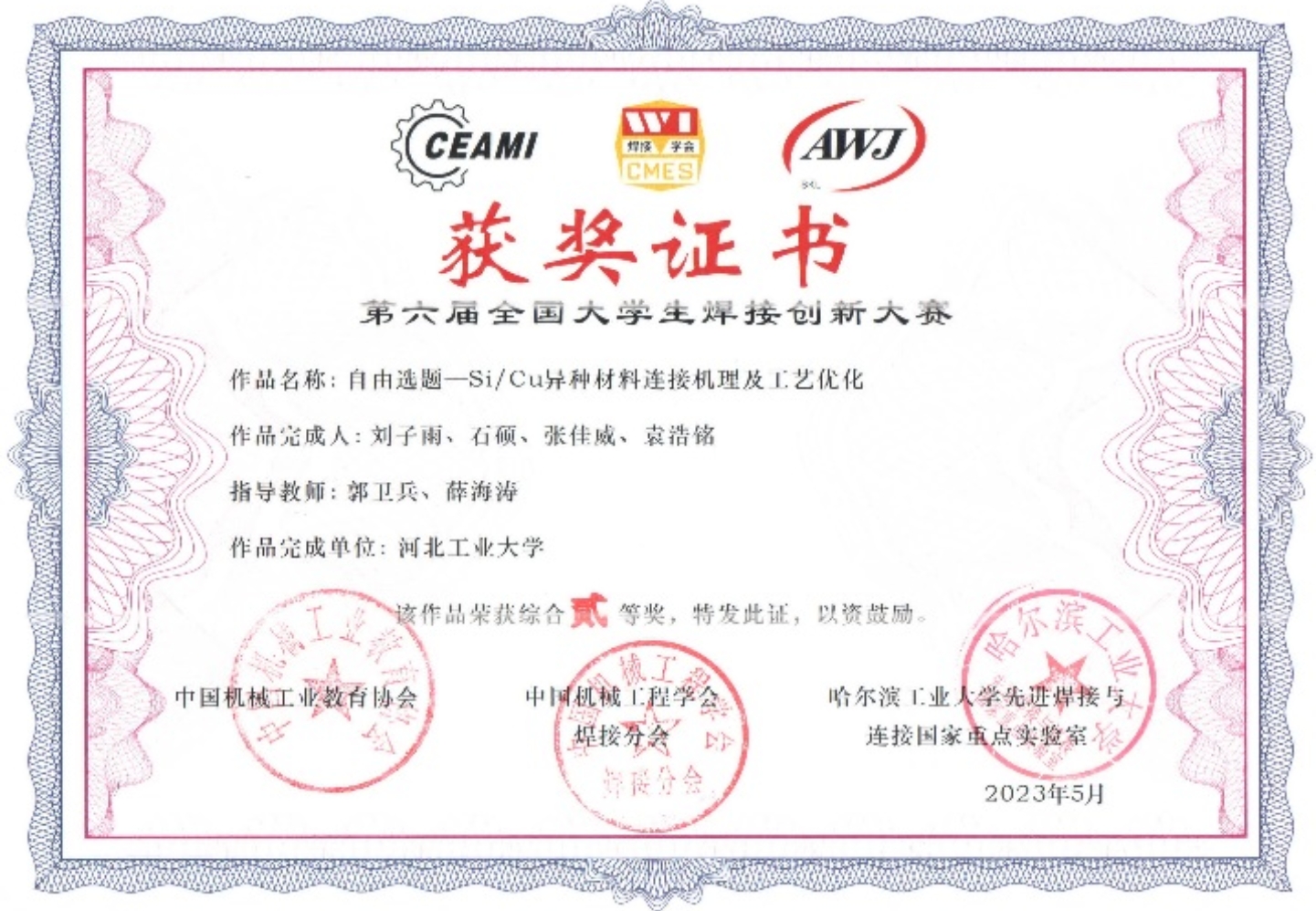 本届大赛是该项赛事创办以来参赛高校数量、参赛队伍数量、参赛师生数量最多的一届比赛,吸引了来自清华大学、哈尔滨工业大学、天津大学、西北工业大学、吉林大学、yl23455永利集团等62所国内高校的187项参赛作品,包含留学生在内的400余名师生参加比赛。本次大赛作品分固定命题和自选命题,通过作品测试和现场答辩环节综合确定比赛成绩,最终评选出32项一等奖、47项二等奖。其中由我院薛海涛、陈翠欣老师指导的成型202班程亚敏、殷时雨、张梦泽、沈财祥等同学的《刚柔并济--高强高韧复合板的设计及制备》作品获一等奖;由郭卫兵、薛海涛老师指导的202班刘子雨、石硕、张佳威、袁浩铭等同学的《Si/Cu异种材料连接机理及工艺优化》作品获二等奖。