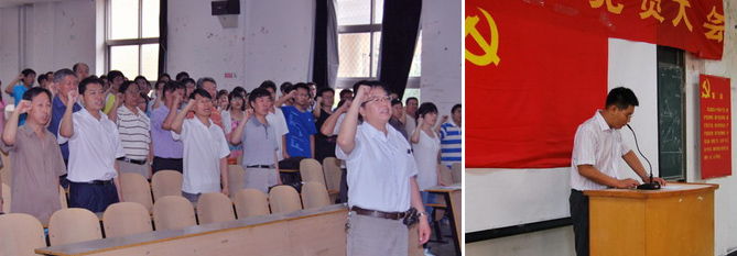 伴随着嘹亮的国歌,大会拉开了帷幕,首先进行了130名新党员的宣誓仪式,由材料学院党委书记崔春翔同志领誓。并请新生党员代表袁配同学代表新党员发言。然后大会对先进基层党组织和优秀共产党员进行表彰。