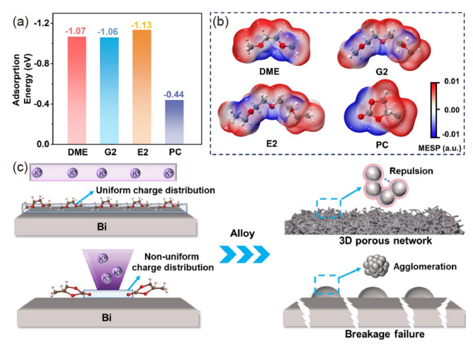 针对合金负极在循环过程中体积波动大导致容量快速衰减,将乙二醇二甲醚基电解液应用于商业化的Bi粉,发现该电解液能够促使体相Bi颗粒在循环过程中演变成三维多孔网络。对比不同电解液组分(阳离子、阴离子以及溶剂)对微米Bi充放电过程中形貌演变的影响,发现线性醚类溶剂是微米Bi发生多孔演变的根本原因。研究结果表明微米Bi的多孔演变源于线性醚类电解液中Bi表面均匀的电荷分布。该三维多孔网络的形成有利于缓解巨大的体积变化、增强界面反应活性和促进K+的扩散,实现了微米Bi在2C(1C = 400 mA g-1)下循环寿命超过1000周以及在-40-40℃的宽温域下优异的电化学性能。这项工作为深入了解微米Bi的多孔演变提供了实验依据,为开发高性能钾离子电池提供了新的思路。(Science China Chemistry, 2024, DOI: 10.1007/s11426-024-2071-y)。
