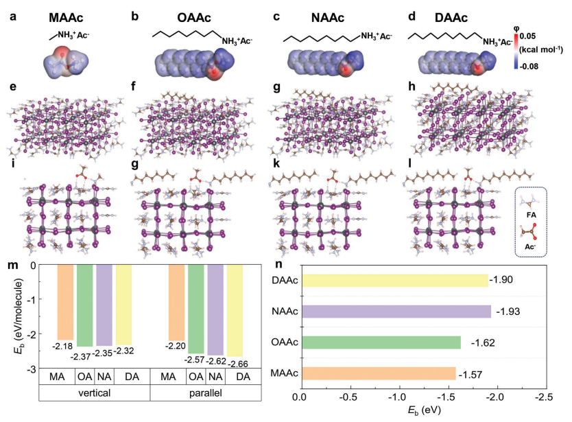 图1不同烷基链长的铵盐钝化剂与钙钛矿相互作用的理论研究